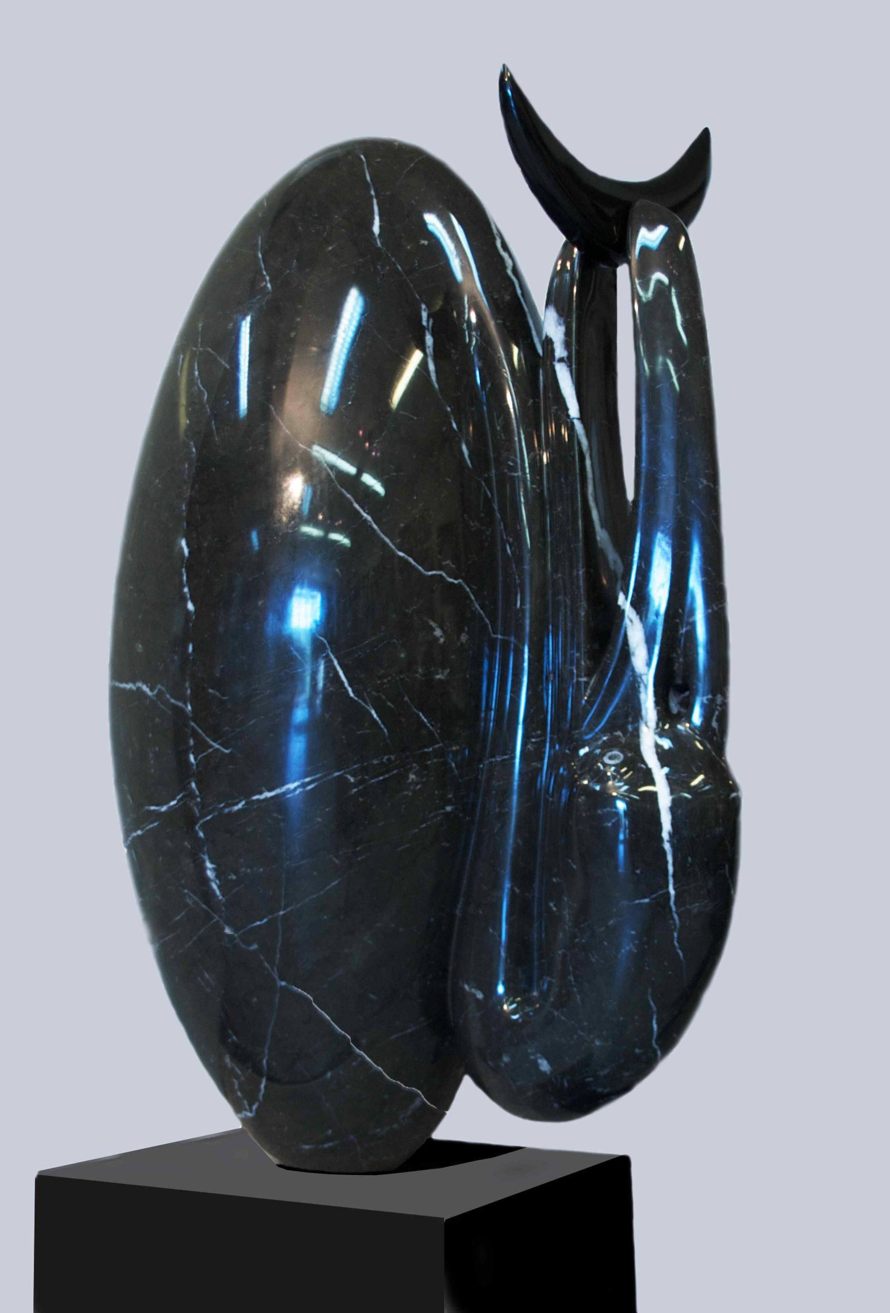 Esta escultura distingue-se pela elegância depurada das suas formas e pela tensão subtil entre organicidade, verticalidade e reflexão luminosa. A superfície escura e polida, marcada por delicados veios claros, confere à peça uma presença sofisticada e quase mineral, enquanto a composição alongada sugere equilíbrio, recolhimento e uma leitura simbólica aberta à contemplação. O jogo entre curvas amplas e volumes mais estreitos cria dinamismo visual sem comprometer a sensação de harmonia, revelando um cuidado formal muito apurado. O resultado é uma obra contemporânea de grande requinte, ideal para espaços que valorizem escultura com linguagem abstrata, presença marcante e forte capacidade de enriquecer o ambiente com sobriedade e distinção.– Gustavo Fernandes
